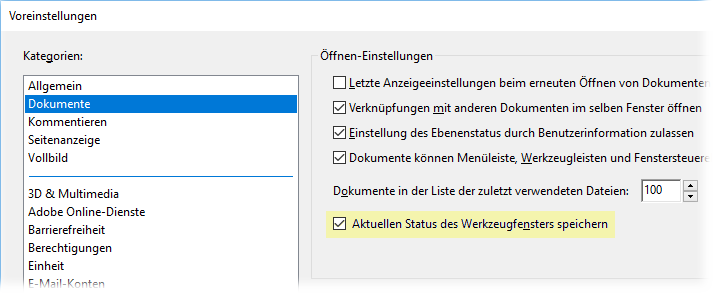 Standardmäßig blendet der Acrobat Reader Werkzeugfenster ein, die im Lesemodus manchmal stören. Um sie dauerhaft auszublenden, setzen Sie in den Voreinstellungen ein Häkchen vor „Aktuellen Status des Werkzeugfensters speichern“. Der Acrobat Reader merkt sich dann Ihre letzte Einstellung.