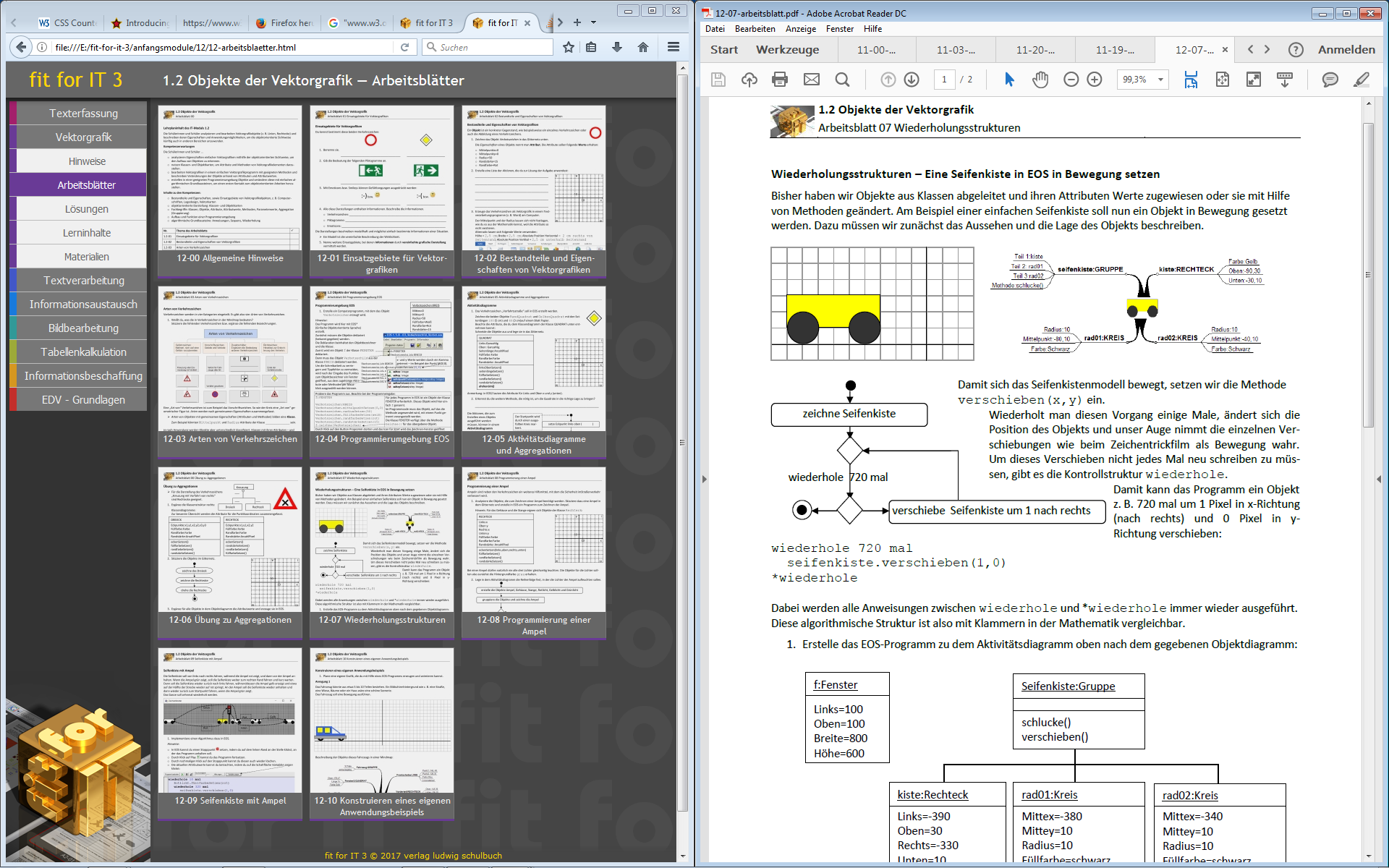 Über die Tastenkombination + wird die Arbeitsfläche geteilt: links die fit for IT 3 -Oberfläche, rechts der Acrobat-Reader mit dem aktuellen Arbeitsblatt – ideal für die Vorbereitung des Unterrichts oder für die Arbeit der Schüler mit den Arbeitsblätter-Formularen.