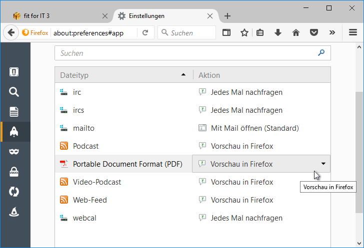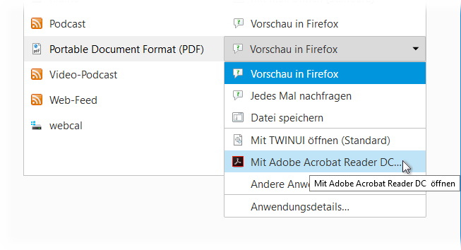 Das folgende Beispiel zeigt, wie Sie im Firefox den von Ihnen bevorzugten Reader festlegen. In anderen Browsern - auch im Firefox mobile - verfahren Sie ähnlich.