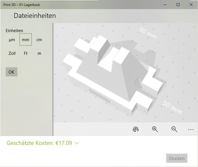 Das Tool „Print 3D“ ermöglicht die Ausgabe der Modelle auf einem eigenen 3D-Drucker. Die Modelle können unskaliert mit den Originalmaßen ausgegeben werden oder bei Bedarf im Maßstab verändert werden.